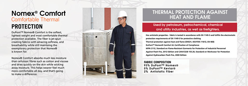 As for comfort, safety apparel made with Nomex® features the lowest possible weight at the highest level of protection; breathability for reduced heat stress; and the ability to effectively wick away moisture.