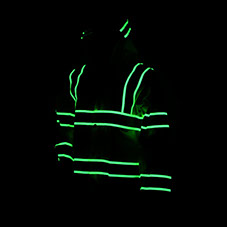 Imagine a garment that provides visible confidence to the wearer in all types of light situations. Alpha's patented VizLite DT tape utilizes innovative phosphorescence technology to solve this low-light problem. As the wearer’s environment becomes “dim” our phosphorescent technology begins to slowly release stored energy that the human eyes sees as a “glow” offering the wearer a new type of visibility. Our patented formula exceeds ANSI standards for visibility and durability. We achieve up to 10 times the required wash/wear life of typical high visibility garments.